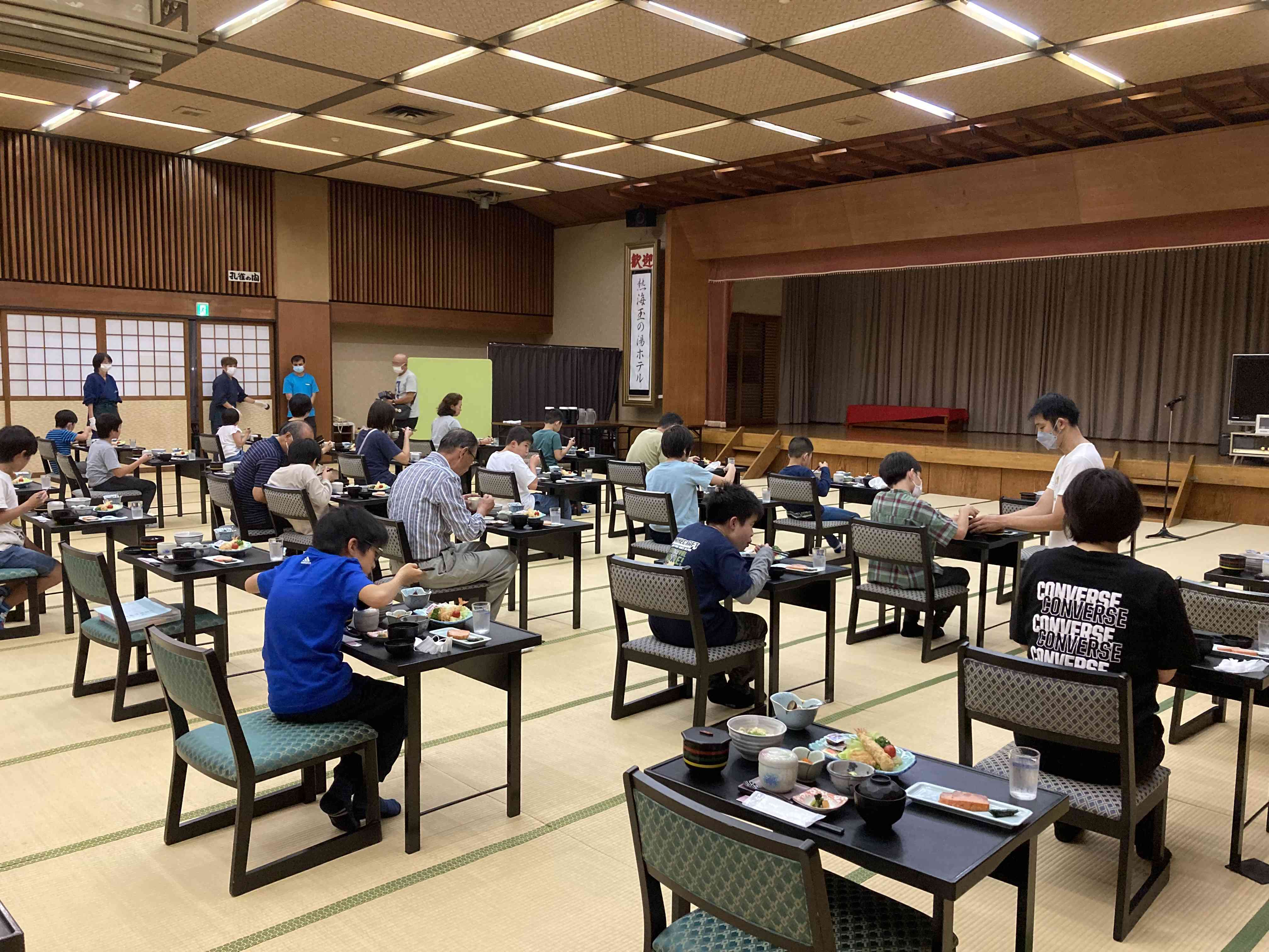 入浴の後は、楽しみにしていた夕食です。 美味しい夕食を、味わって食べていました。感染予防のためのルールをしっかり守り、静かに食べることができました。