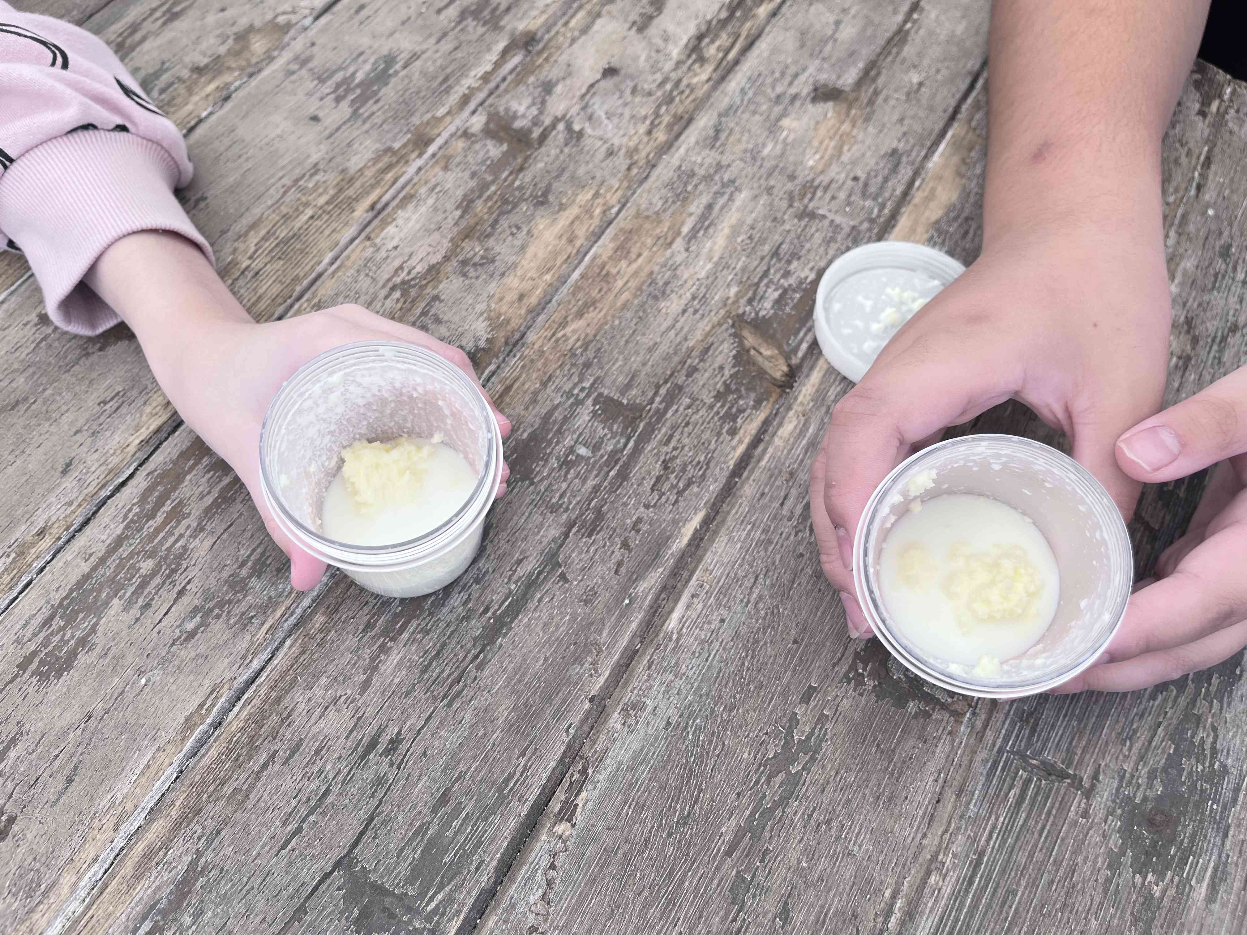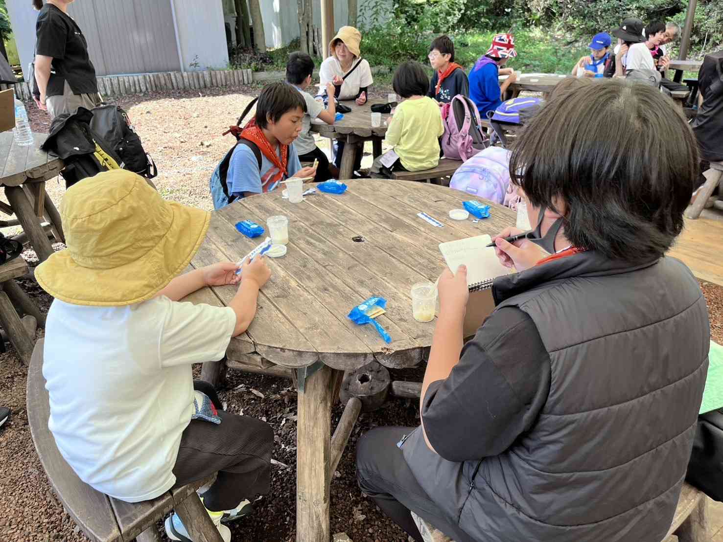 バター作り体験では、液体からどのようにバターへと変化するのか説明を聞き、実際に作りました。ポイントをメモしたり、よく注目したりする姿が見られました。出来上がったバターはその場で美味しくいただきました。 班行動では、事前学習で考えたコースを回りました。動物ふれあいやアスレチック遊びなど、広い施設の中をたくさん移動して思い切り身体を動かしました。